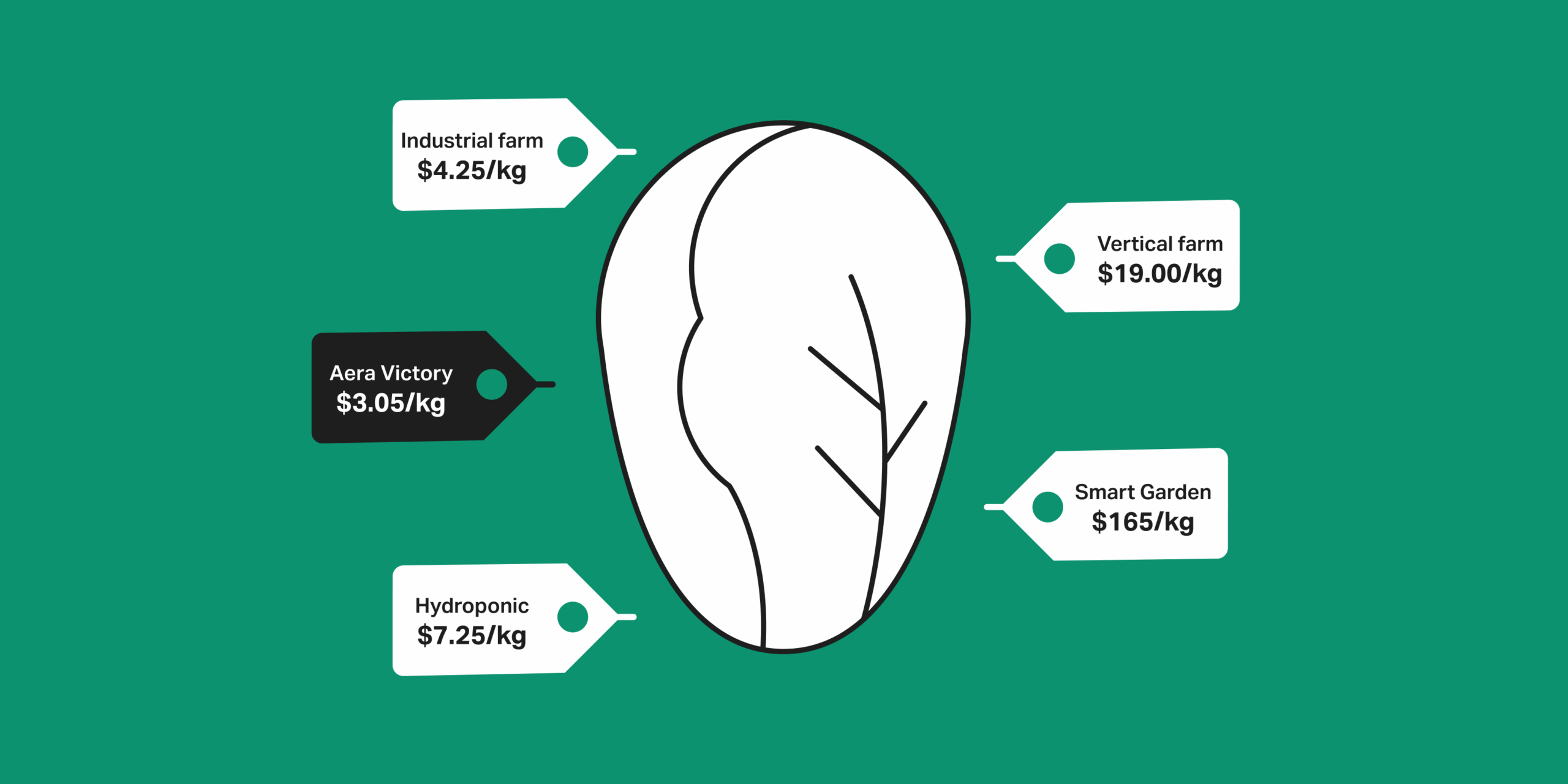 The data in both the cost and environmental tables is based on a mix of publicly available research, industry case studies, consumer product data, and Aera’s internal modeling. Our goal was to create a fair, apples-to-apples comparison between the dominant systems used to grow leafy greens — from large-scale industrial farms to countertop smart gardens.